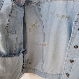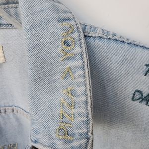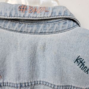 Make all the statements in this one of a kind piece! This Y2K light wash denim jacket from Pac Sun will go with everything! High attention to details, all sayings are embroidered! Sayings on the back, the sleeves, the folded down collar, so dope!