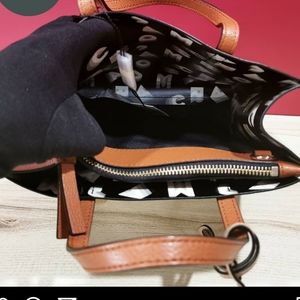 Small leather tote bag with optional crossbody strap.
