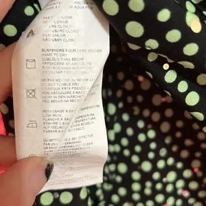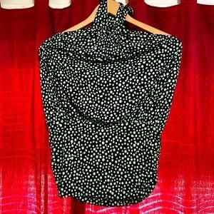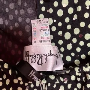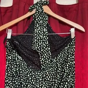 Measures 15.5 pit to pit and 19 length. Joseph Ribkoff designer tank off the shoulder and tie around neck black with green polka dots with silver sparkles. Has rubber around top to stay in place. Excellent condition never worn. Size 8.