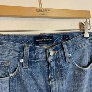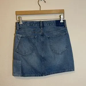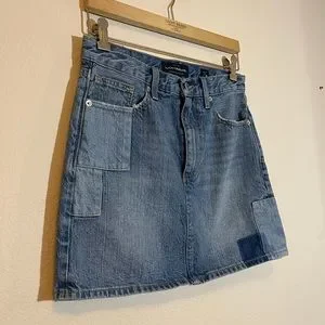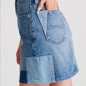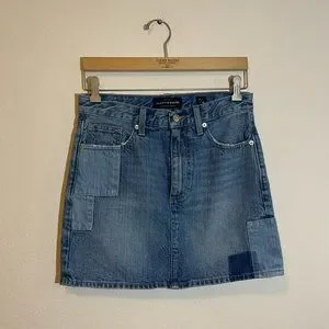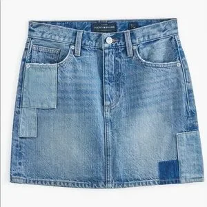 Only worn twice in like-new condition. Super cool denim mini skirt from Lucky Brand with unique color block patchwork. Size 26. Retail $79.