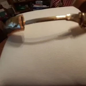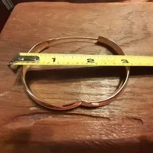 14 K Gold, not filled or plated. Bangle weighs 9.9 grams.The expandable opening is 2 1/2 inches closed and 3 1/4 inches open. Bracelet is 8 .15 mm wide. Engravable. Preowned .