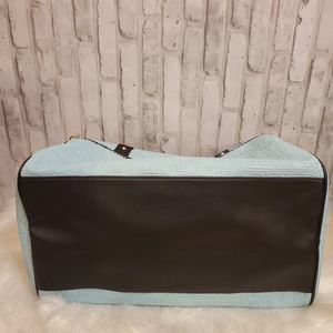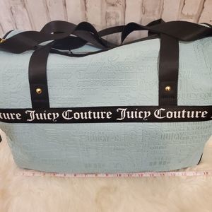 NWT Be ready for that spring trip with this Juicy Couture Word Search Our Zip Says It All duffle bag in a gorgeous baby blue color. Get all your essentials in one great bag. Covered inside and out with the classic Juicy logo, this duffle features a large hidden zippered pocket on the front, a very spacious interior compartment, three slip pockets and one deep zippered pocket on the inside. Has adjustable crossbody strap and handles with a 10in drop. Additional approximate measurements shown in photos. Brand new!!!
