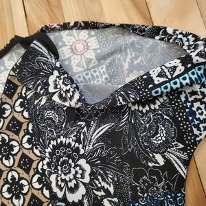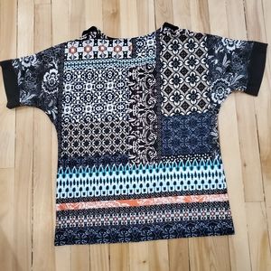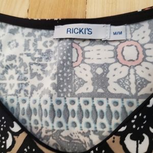 Funky pattern woman's shirt from Ricki's. Featuring open shoulder slits that expose shoulders ("cold shoulder"). See photo 3. In good, used condition. Size Medium.