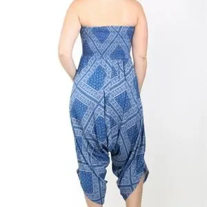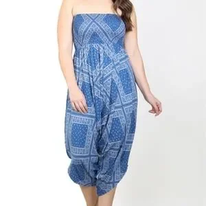 #154 NAVY WHITE PRINT SMOCKED TUBE PLUS SIZE JUMPSUIT