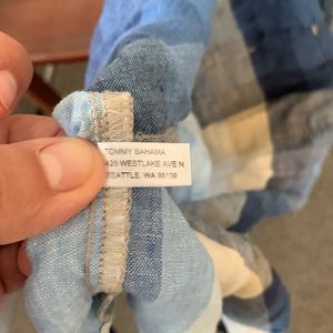 Tommy Bahama relax blue plaid modern fit short sleeve 100% linen, large. Im a size L and fit me fine however if you are a medium size it would of fit just right! (I didn’t button all the way during use at the beach).