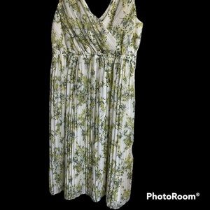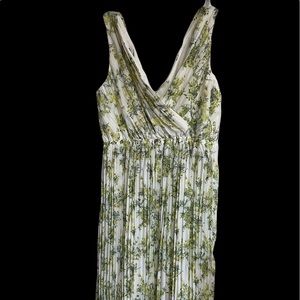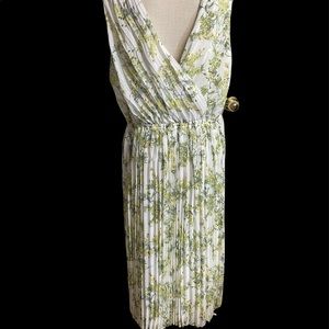 Alex Marie Sharons pleated Early Blooms midi sleeves dress with surplice neckline elastic waistband V front and back neck. (Accordion pleated). Measurement across bust is 22”. Waist 19 to 24 inches.