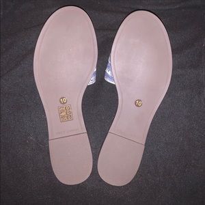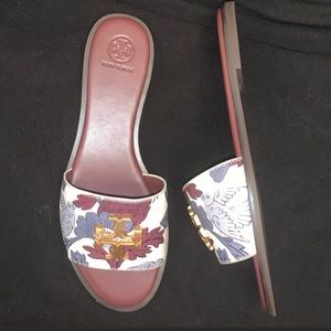 Beautiful Tory Burch sandals with flower detail and gold Tory emblem. Loved this shoe but didn’t work for my very narrow feet. Color of sole is purple and flowers are purple and blue with a white base. (Box included)
