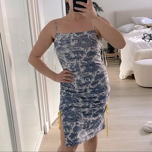 New with tags and super stretchy toile blue dress from staud! Purchased it and literally never wore it. Gathers on the side. Originally $200!