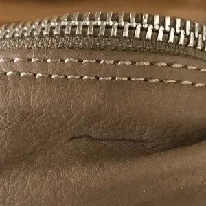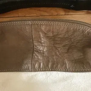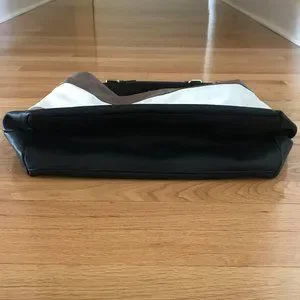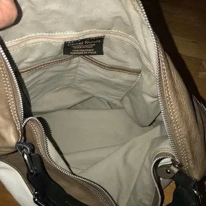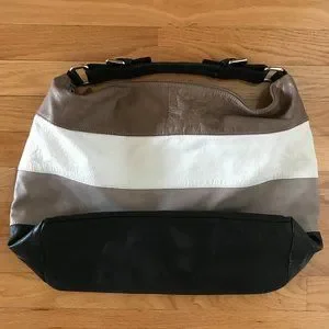 Gianni Notaro Made in Italy Leather Color Block Shoulder Bag. Black, taupe, cream, and brown horizontal sections. Gray fabric lining in a cotton twill-like material. One section interior with side slip and zipper pockets. Top zipper closure. Single black shoulder strap with silver toned buckles. Excellent pre-owned condition. Clean. One pen mark near the top zipper. See the last picture.