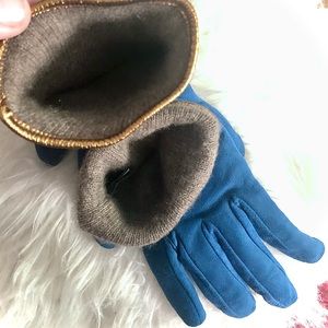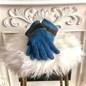 - Gold trim lined, Cornflower Blue Suede feeling Leather exterior with rich, luxe Brown slick Pebbled Leather accent strips on the top of each glove, with original hand done artistry Gold Fleck detailing on each strip