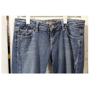 Paige Curson capris with darker denim cuffs, thick durable denim with mild stretch, and silver bead accents at right front pocket and linking cuffs at bottom - excellent used condition measurements taken flat: waist 16โ, rise 7.5โ, inseam folded 24โ, inseam unfolded 27โ.(F22)