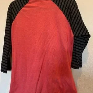 Like new. No tags but it was not worn. A heather coral body with black and gray stripe sleeve