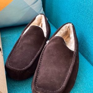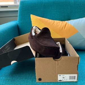 Men’s UGG Ascot slippers, Espresso. 100% water-resident suede with rubber bottom. Size 13 never worn. Can be worn indoors & out. In original box.