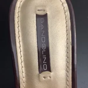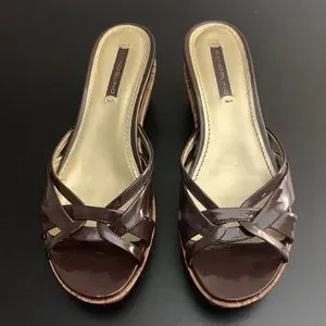 Bandolino brown wedge sandals with a patent leather look (man made material), cork wedge and rubber sole. Size 8M. Cute and comfortable and in good used condition. Scuff and nick on right shoe (toe area) as seen in photos 7 & 8. Wedge is 1.25” at toe (lowest part) and 2.75” at heel (highest part).