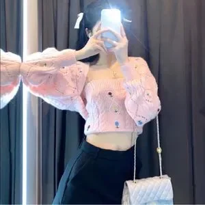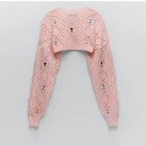 Zara Pointelle Pink Knit Arm Warmer Cropped Sweater with contrasting accent flower shaped embroidery