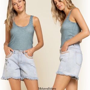 Boho Embroidered Distressed Denim Shorts