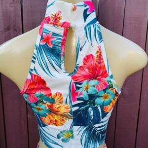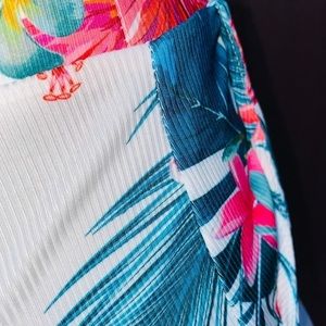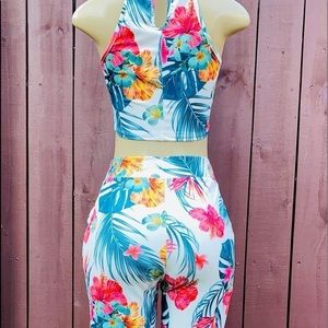 2 piece tropical matching style. The stretch is incredible, and the fit is spot on. Pants with side pockets that are long and mid-waisted. Great fitted top with button details at the neck to adjust the fit. With this look, you'll be ready for a summer vacation!