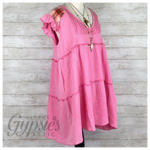 Designed in a Loose/relaxed fit, a double gauze mini dress with ruffle detailing, contrast woven Plaid panels on the shoulders, Pleats down the center front bust, Double Tie Neck & Back, and ruffled bottom hemline for added dimensional Draping.
