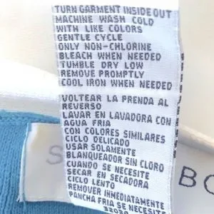 Turn garment inside out, machine wash cold with like colors, gentle cycle, only nonchlorine bleach when needed, tumble dry low, remove promptly, cool iron when needed.