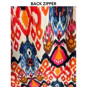 Adorable boho inspired maxi dress with sweetheart neckline. The top bodice is smocked in back to provide a lot of stretch and good fit. The dress runs a little large in my opinion so it could fit a large also. It is light flowing fabric which is perfect for spring and summer. I have the dress myself and it is comfortable and gets lots of compliments!