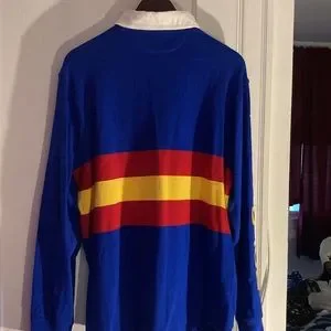 Ralph Lauren polo long sleeve three buttons white collar blue red and yellow stripe polo sportsman comes from a pet free smoke free home willing to trade for the same shirt in a medium this large is just too big for me. New with out tags never worn