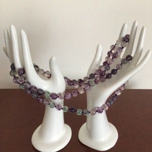 These semi-precious beads are called rainbow fluorite. In fact, it doesn’t look like a rainbow, but it is still very original in color. Beads are strung on a purple string and are separated with a knot. The necklace has an "opera length”- 31 in. No clasp.