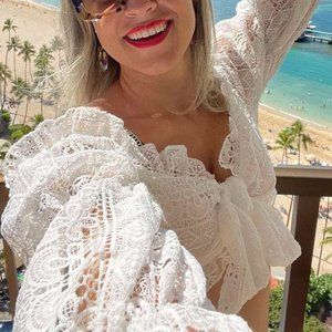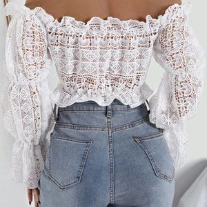 Bell Sleeve Tie Front Lace Ruffle Trim Crop Top