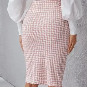 Button Detailed Houndstooth Print Midi Skirt - pink