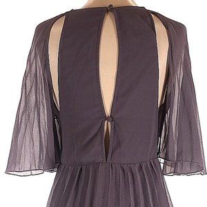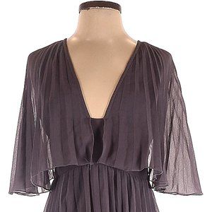 Rare find! An absolutely stunning statement dress with an old Hollywood vibe! Very flattering and impressive piece, a true showstopper. Comes in gorgeous grayish lilac. Designed with pleated texture, a tiered cascading maxi skirt with great flow and movement, V-neckline, flutter sleeves that create the effect of a cropped cape jacket, side zipper for easy on and off, back button fastening, and beautiful cuts out on the back. It will look amazing with strappy heels and a mini clutch. Made out of light, floaty chiffon (100% Polyester). Size 4 US. Was purchased from Nordstrom. Approx measurements: Length 63", Waist 12.5". NWOT from a smoke-free home.