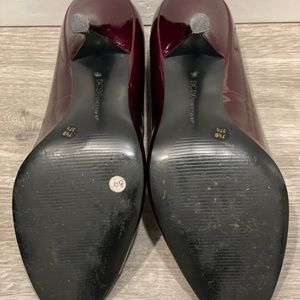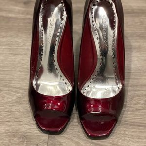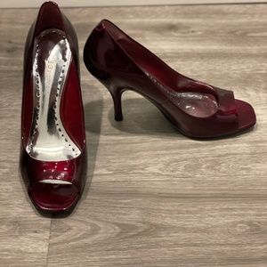 Beautiful open toe, patent leather shoe with a 4 inch heel in a cherry red color.
