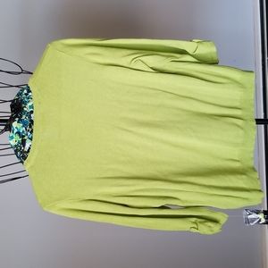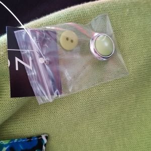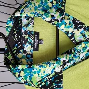Notations. New with tags and extra buttons. Buttoned front shirt with attached sweater. Size PL. Measuring 20 inches armpit to armpit, 23 inches long, sleeves are 3/4 , 17 inches with a cuffs. 60% cotton, 40% Acrylic. Shirt is 97% polyester 3% spandex. Beautiful Green and blue colors!