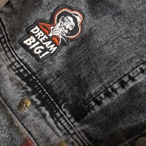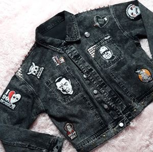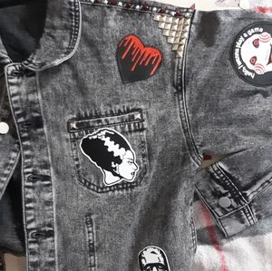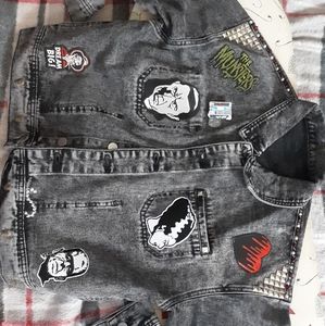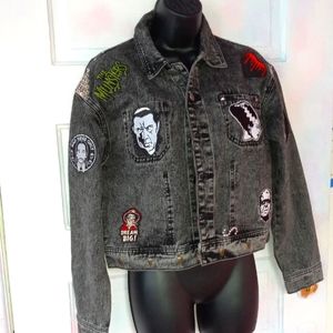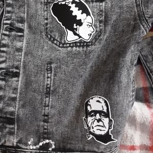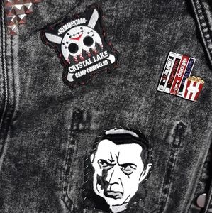 this piece is perfect for the horror movie lover! Giant full embroidered Bela Lagosi's dracula, frankensteins monster, bride of Frankenstein, The Munsters universal studios official patch, heart dropping blood, freddy patch stating "Dream Big", Wednesday Adams patch that states "bad vibes only ", and Jigsaw patch! back will have XXLtshirt back art from a vintage universal studios old monster classics flow in the dark tee, so cool! Plenty of cool metal work and hematite stones and rad classic 70s horror movies enamel pin!