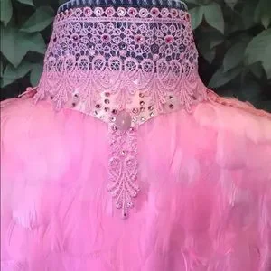 The Flamingo" - ABSOLUTELY STUNNING with genuine rose quartz cabochons. This is a unique denim jacket original design by Pamynthia Designs. Beautiful and unique for the beautifully unique! Hand crafted with pink feathers, genuine rose quartz cabochons, vegan leather braiding, Swarovski Crystals, and silver tone beads on a "new" Blue Age denim jacket. Feathers are individually hand sewn into this jacket. This is not a recycled piece of clothing, this is a brand new jacket upscaled with our original design.
