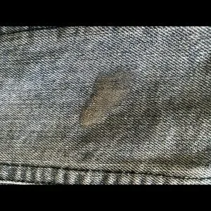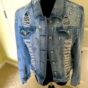 AZI denim jacket. Distressed denim with rhinestones and ripped effect. Silver paint smudge effect through fabric. Size small