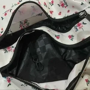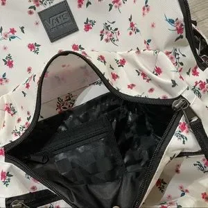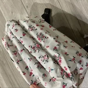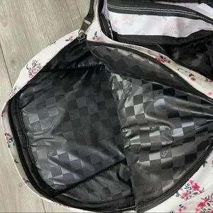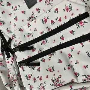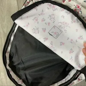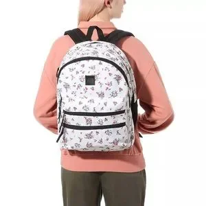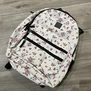 The Schoolin It Backpack is a 60% polyester, 40% recycled polyester backpack featuring multiple storage compartments, an interior laptop sleeve, side water bottle pockets, and an allover floral print. It also includes padded shoulder straps and a leather logo patch. Measuring 45.09 H x 30.48 W x 19.05 D cm, it has a 30-liter capacity.