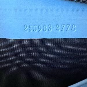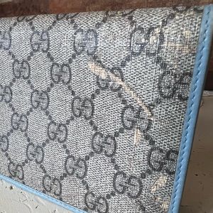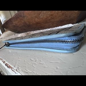 Zips around, canvas, has navy, white and light blue color stripe down edge, 12 card slots, 2 month slots. Chocolate leather cord has been added to the zipper pull, original one is missing. Wallet has several marks on outside- see photos. Cosmetic problem only.