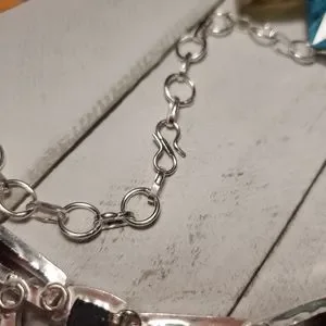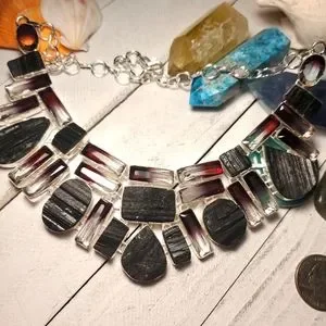 beautifully hand crafted silver tone big statement necklace with 11 rough tourmaline stones and 19 bi- color tourmaline stones. the overall length is 20" with a S hook clasp. 925 silver overlay.