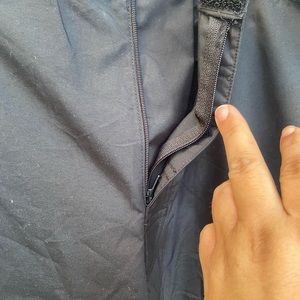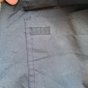 Adjustable elastic cord at waist and ankles. Zipper and velcro closure, as can be seen in the pictures. Embroidered detail back of leg.