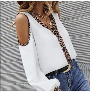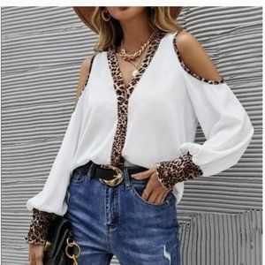 Brand new with Tag. This leopard print contrast cold shoulder blouse brings the sexy looks on your daily appearance. Wear it with jeans and heels or flats !!!