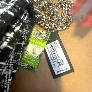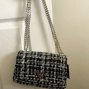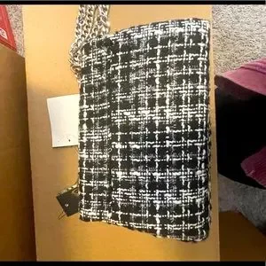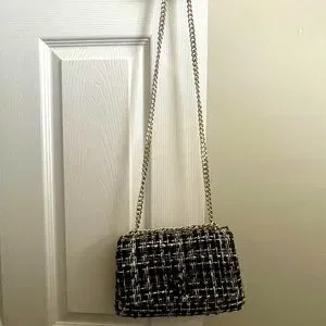 NWT Badgley Mischka Black vegan leather tweed textured messenger bag with silver heavy chain. Two length options can be shoulder or crossbody.