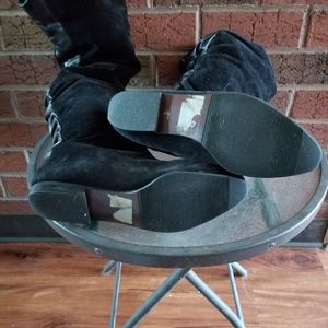 WOMANS' VINTAGE OVER-THE-KNEE SUEDE BOOT W LEATHER STRIPEDOWN BACK. FLAT Sz7 ITA