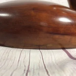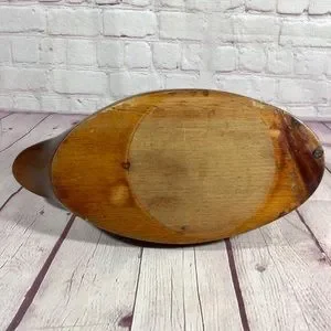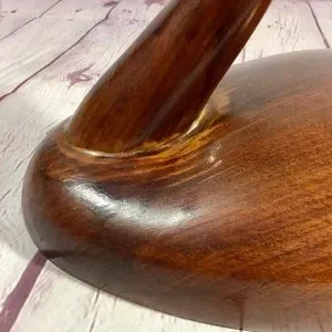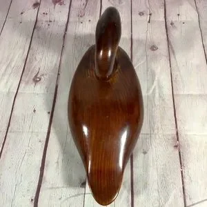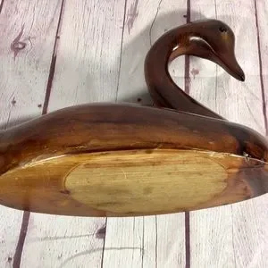 Vintage hand carved wood swan with glass marble eyes. This beautiful piece measures approximately 9” tall, 13 1/2” long, 6 3/8” wide. Good vintage condition. There is a crack in the bottom base of the wood as seen in the photos. Smoke free home.