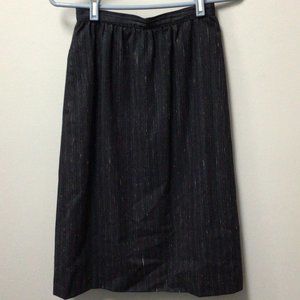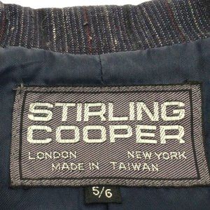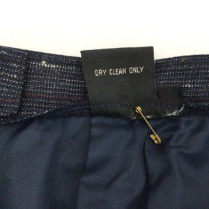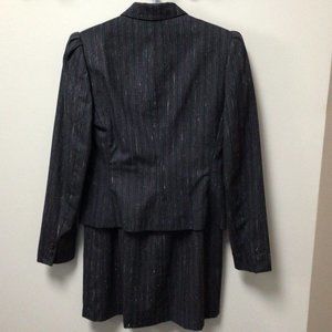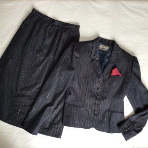 Stirling Cooper - Vintage Navy blue skirt & jacket suit with red & white vertical threads running through. Excellent condition. Jacket has two, three inch deep front pockets, a five button front closure, and a breast pocket with maroon color pocket square to match the random color threads running through the material. The skirt has a center back zipper with single button closure, and side slant pockets. This suit has a sharp, professional look to it. See photos.