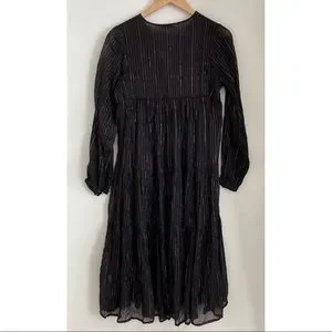 Matta Yamini Rainbow Striped Midi Dress in Black. Features long sleeves, button cuffs, long midi length, mini pinstripe metallic rainbow stripe threading, double tie front closure, and semi sheer silhouette (no slip included). 100% cotton. Great used condition, no notable flaws.