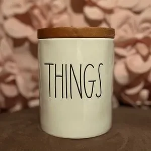 New, never used! Rae Dunn THINGS Jar with wooden lid. Bathroom/Kitchen/Office/Vanity accessory, organize.