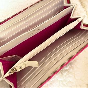 Kate Spade Moroccan Market Zip Around Leather Wallet in bubblegum and deep purple. Black patent leather logo on front with pink, purple and white design. Gold hardware zip around with black patent pull. Interior accordion style, middle zip pocket between slip pockets and 6 card slots on either side. Front side of slip pockets shows middle stitching partially come undone but does not affect Wallet. Back slip pocket. Very slight wear on outside edges as shown otherwise Wallet is clean and in great condition!