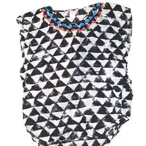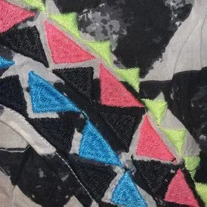 Trim detail around neck in embroidered blue, pink, and yellow ric rac pattern