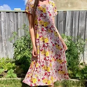 buttons down the full length of dress (front) and laces up at the back, allows for the waist and bust to be adjusted. gorgeous full skirt, square neckline, retro floral print. originally bought from asos a few years ago but hardly worn