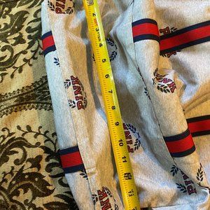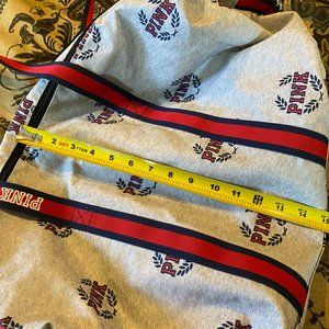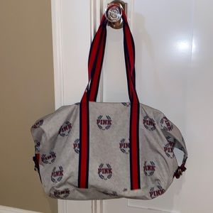 PINK Victoria's Secret Weekender Duffel bag - grey with logo print and blue and red striped webbing. Zip on top. Measures approx 7 x 14 inches base - approx 15 high