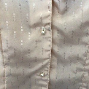 Jonathan Martin - Pink blouse with chevron design and pearlized buttons. Fitted look with darts in front and back. Small snags in the material in back, but still looks great with a blazer or sweater. See photos.